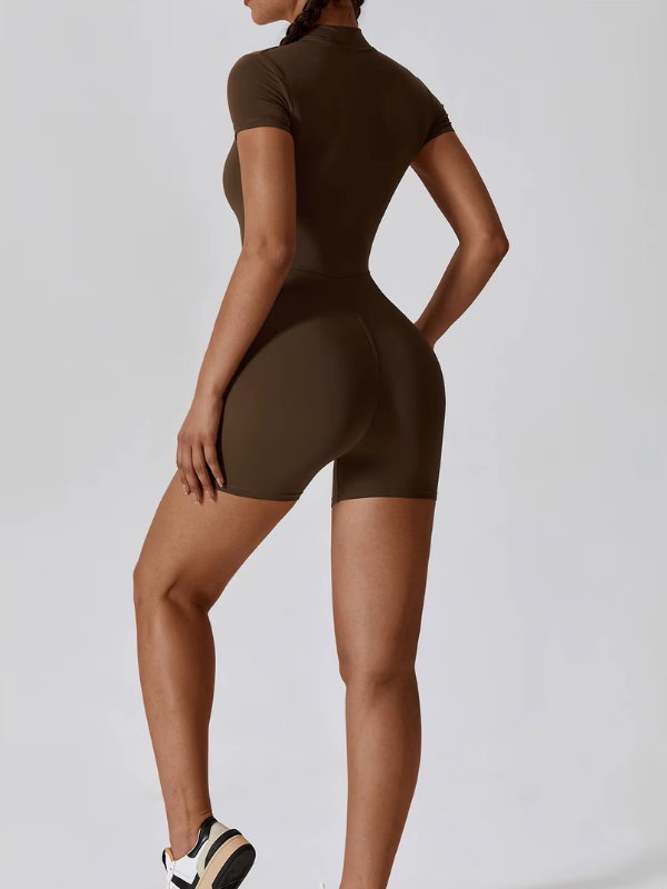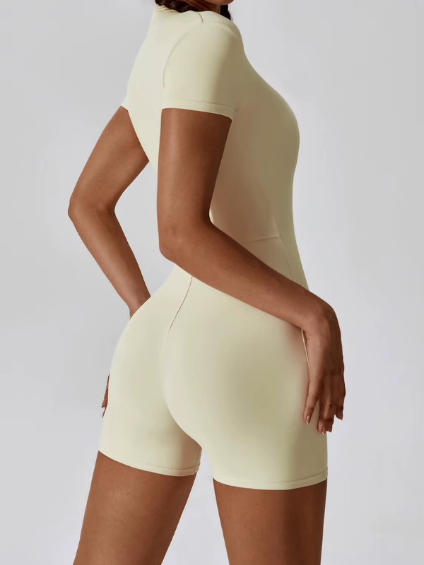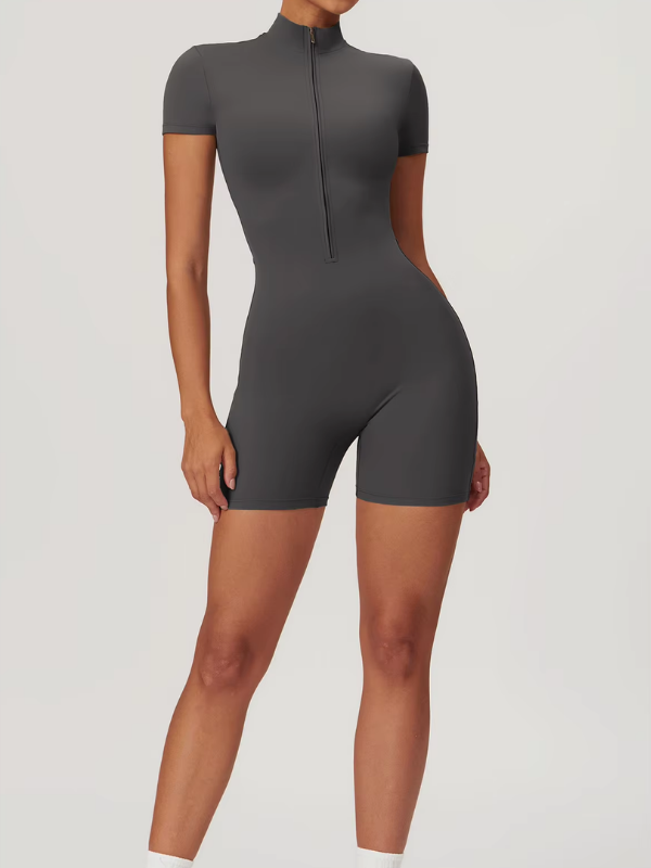 Combinaison courte à manches courtes avec zip frontal, conçue pour un maintien sculptant et un confort optimal, parfaite pour le sport comme pour un look athleisure affirmé.